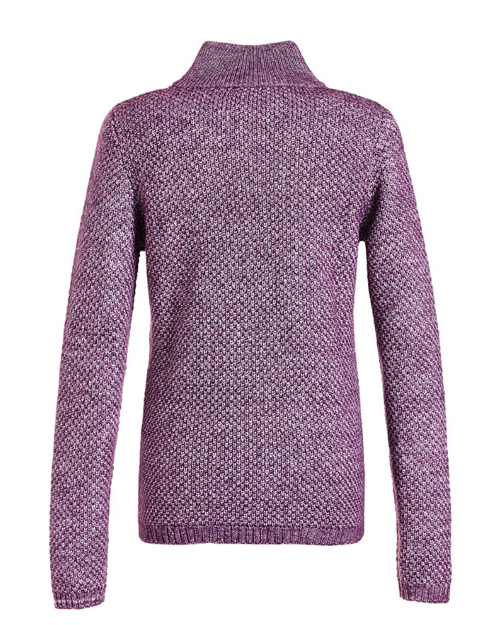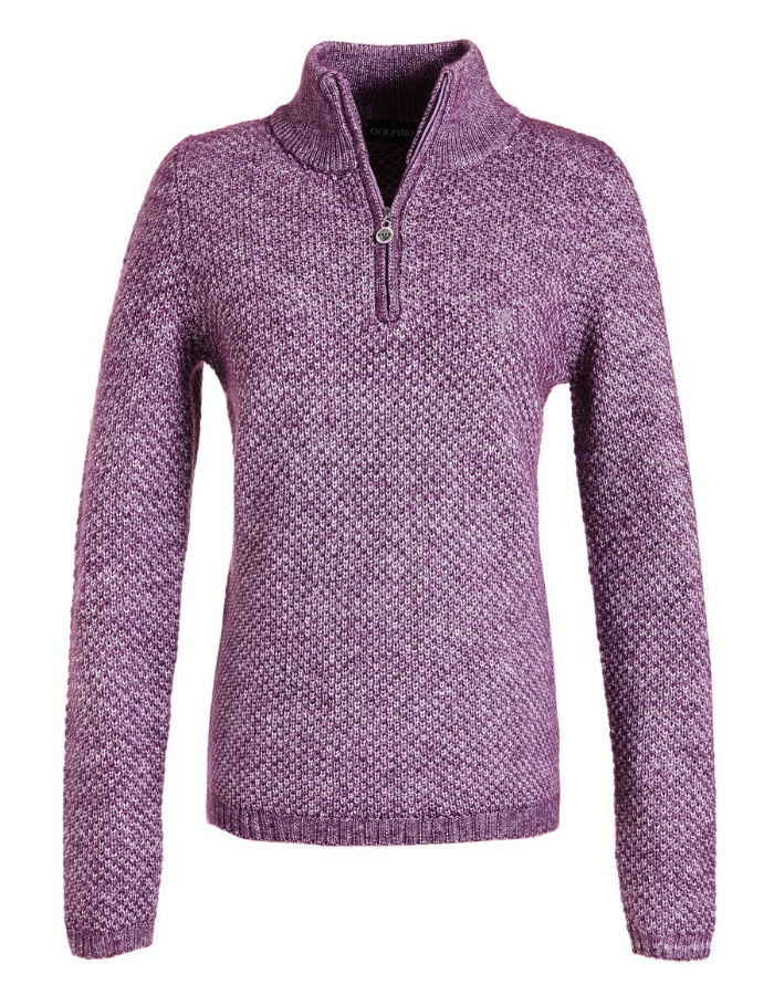 Der modische Damen Strick Troyer aus Melange Garn besticht durch die farblich abgesetzten und gerippten Bündchen am Stehkragen mit Reißverschluss, Saum und an den Ärmeln. Zu den weiteren Highlights gehört die GOLFINO Logo Stickerei mit glänzender Umrandung an der Brust.