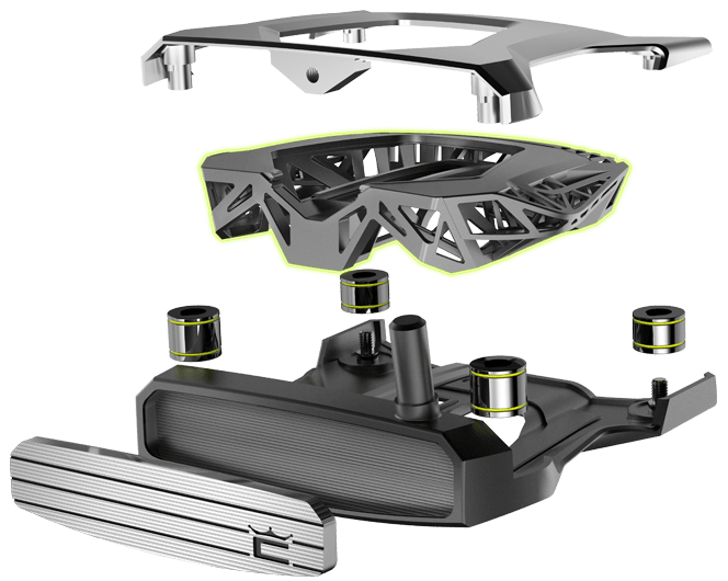Ein 261 g schweres Stahlchassis senkt den Schwerpunkt und sorgt für strukturelle Stabilität, um die anderen Komponenten zu unterstützen.