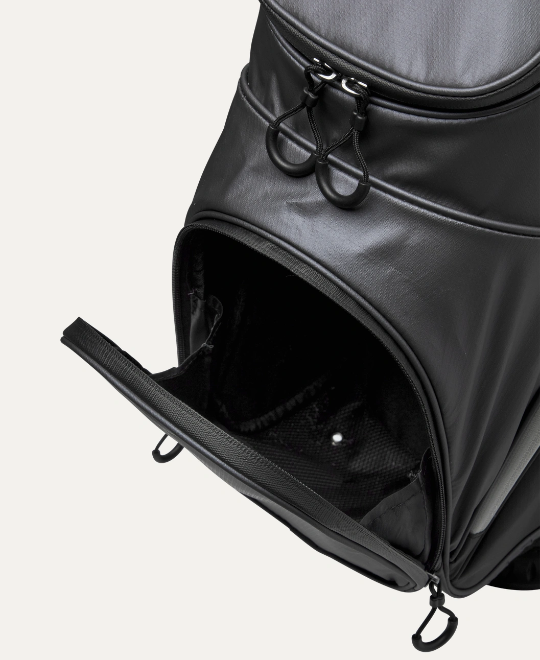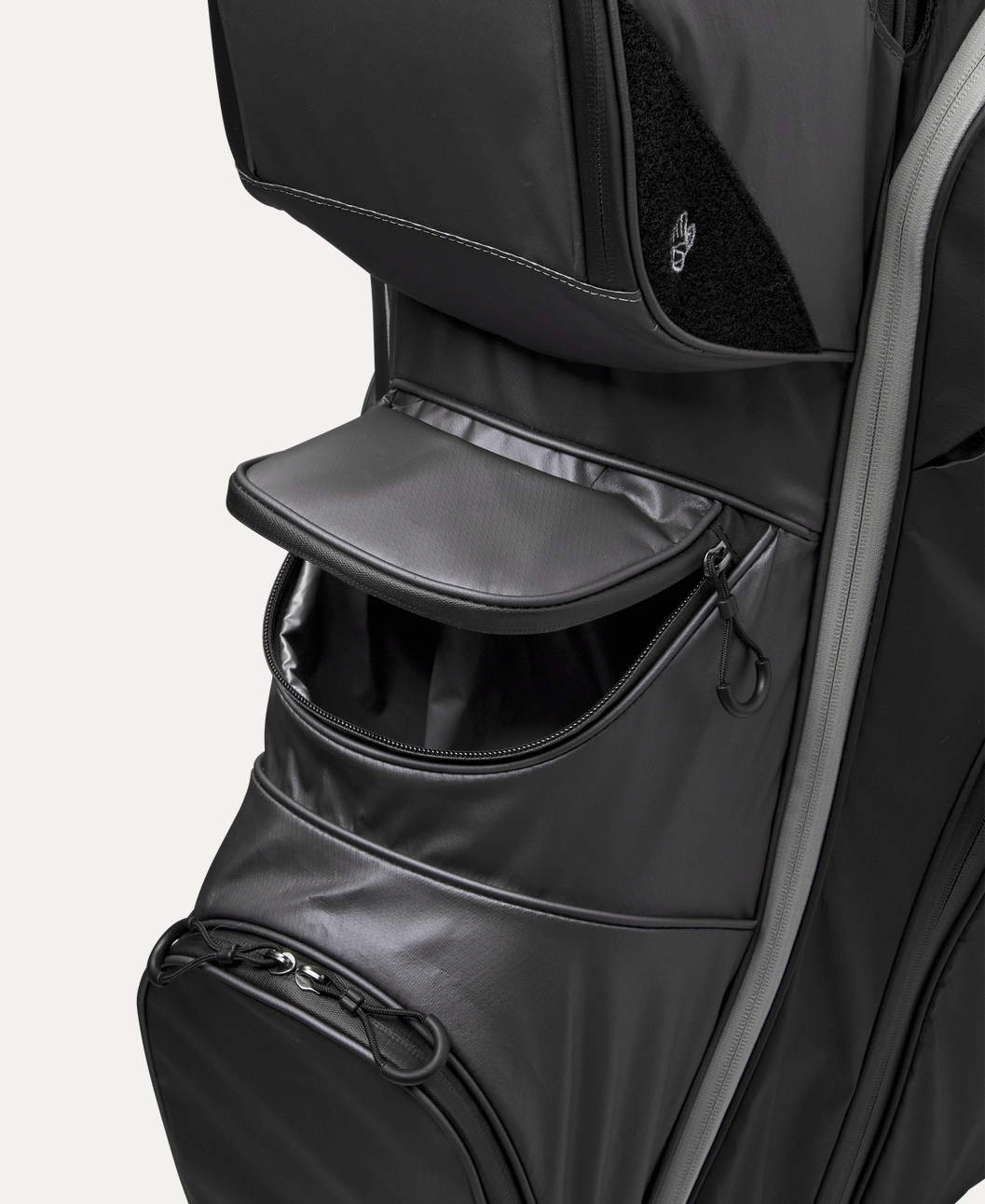 2 durchgehende Kleidertaschen // 2 verdeckte Reißverschlusstaschen für Wertsachen // 1 Tasche für den Entfernungsmesser // 1 Balltasche vorne
