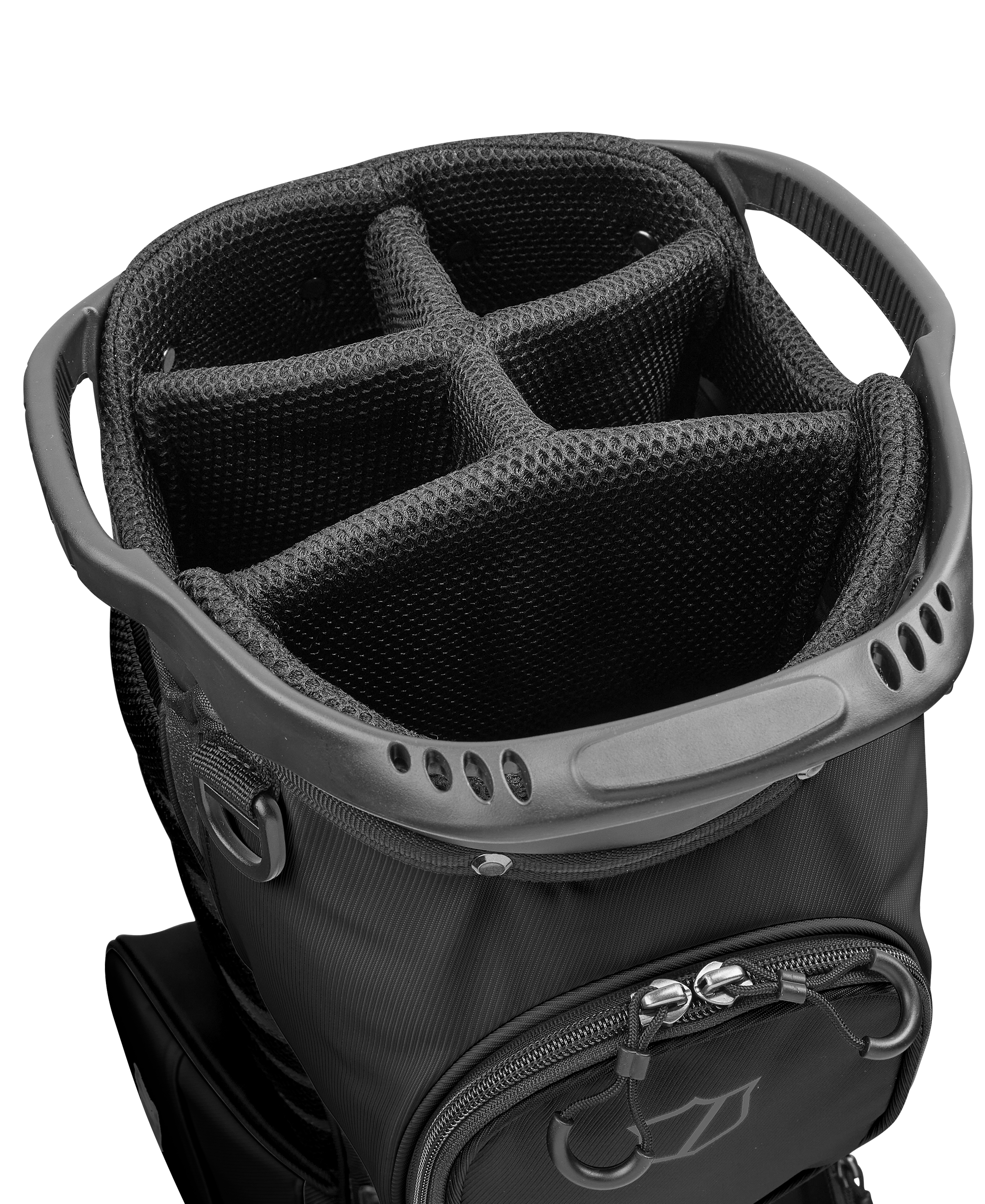 Der Talus ist der ultimative Hybrid – er vereint die Vielseitigkeit eines Standbags mit der Stabilität eines Premium-Cartbags. Er verfügt über eine 14-fach-Einteilung mit Tragegriff und neun speziell angefertigten Taschen: