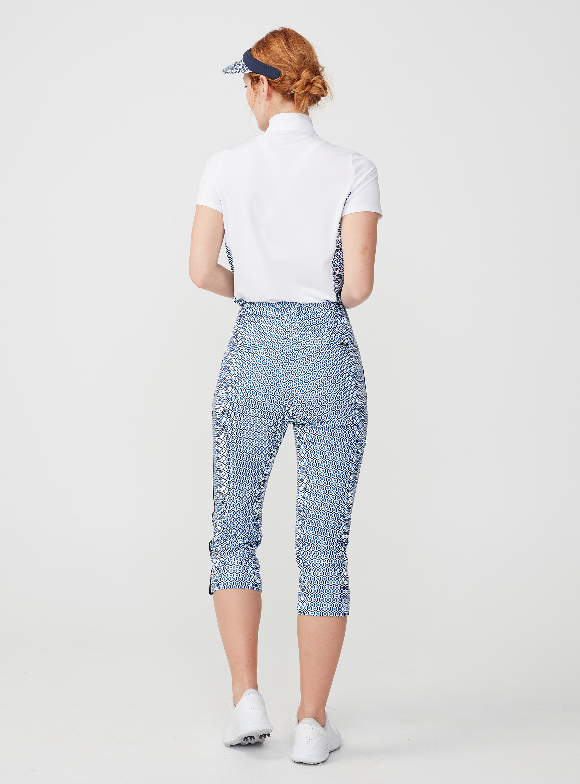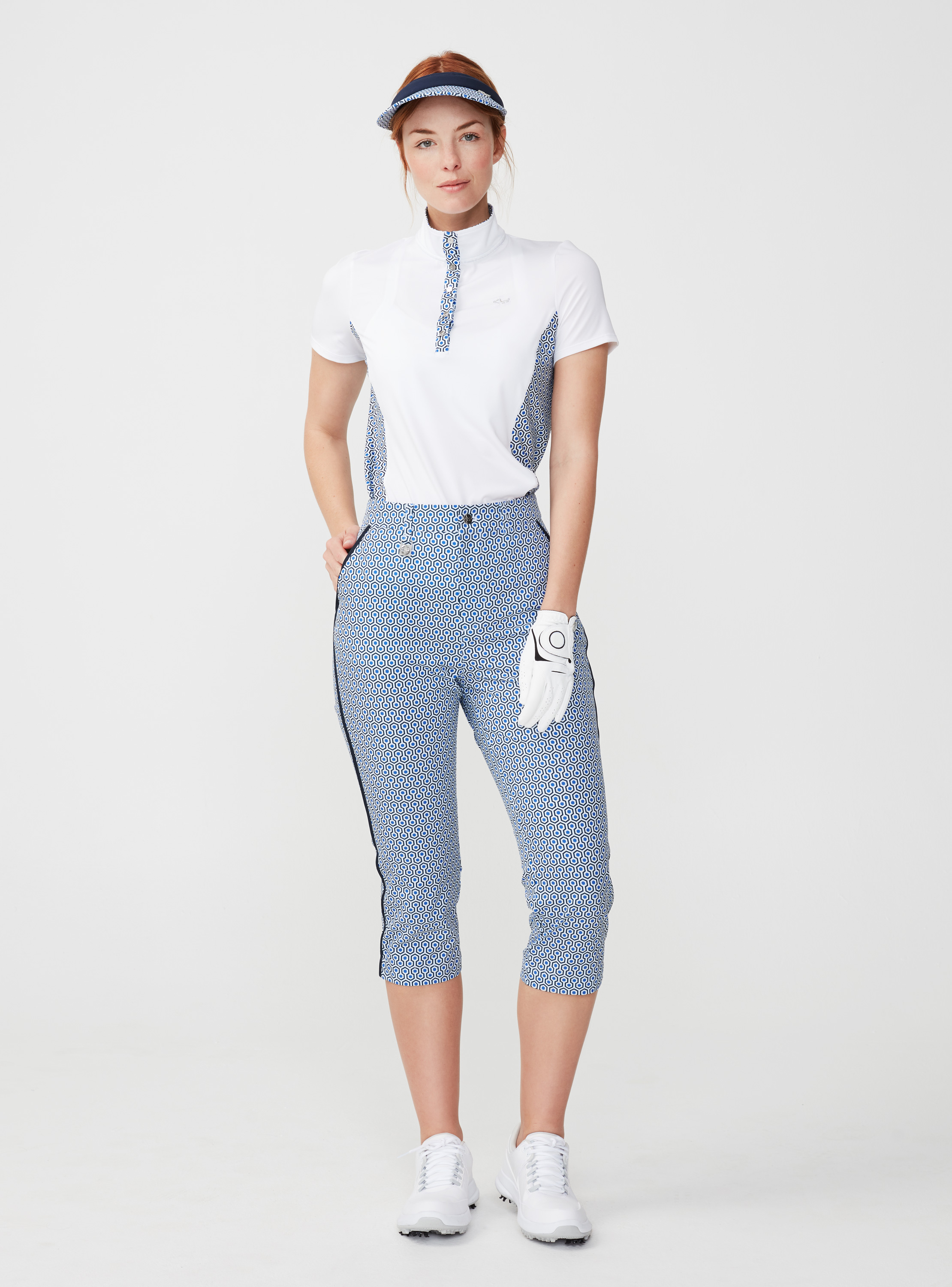 Golfpoloshirt mit Muster an den Seiten, entlang der Knopfleiste und an der Innenseite des Kragens. Aus recyceltem, funktionellem Material, das weich und stretchy ist, mit hoher Atmungsaktivität. Silberne Druckknöpfe vorne, die für einen Stehkragen bis ganz nach oben geschlossen werden können und einen sportlicheren Look erzeugen.