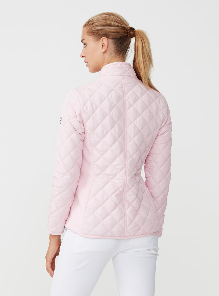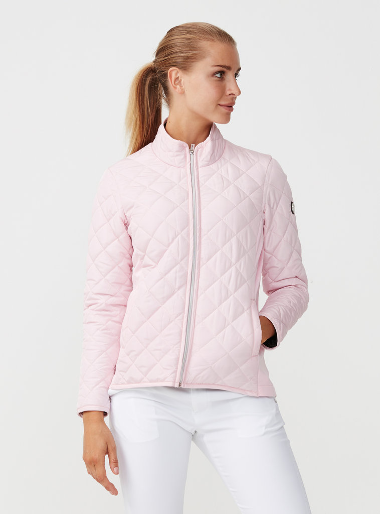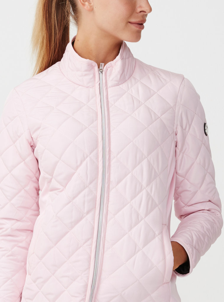 Bei dieser klassischen rosafarbenen Steppjacke mit winddichtem Futter sorgen seitliche Stretcheinsätze für hohe Bewegungsfreiheit. Das Modell kann sich sowohl auf dem Golfplatz als auch im aktiven Alltag bestens sehen lassen.