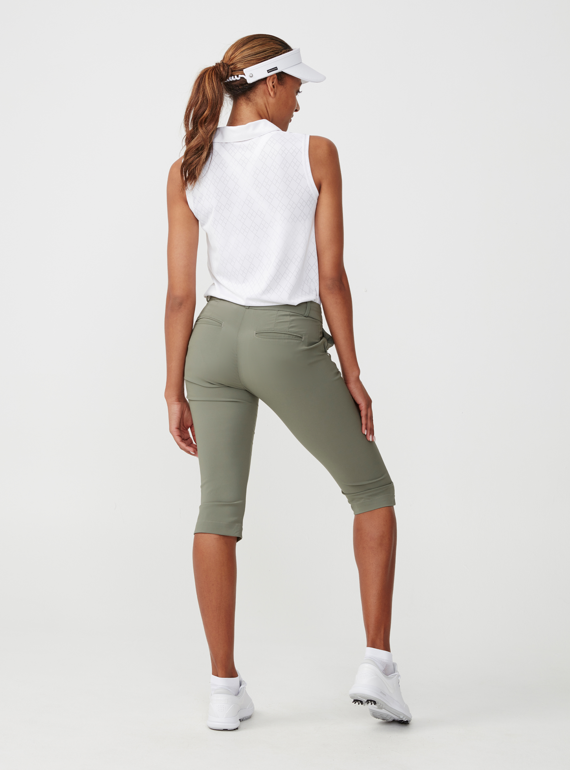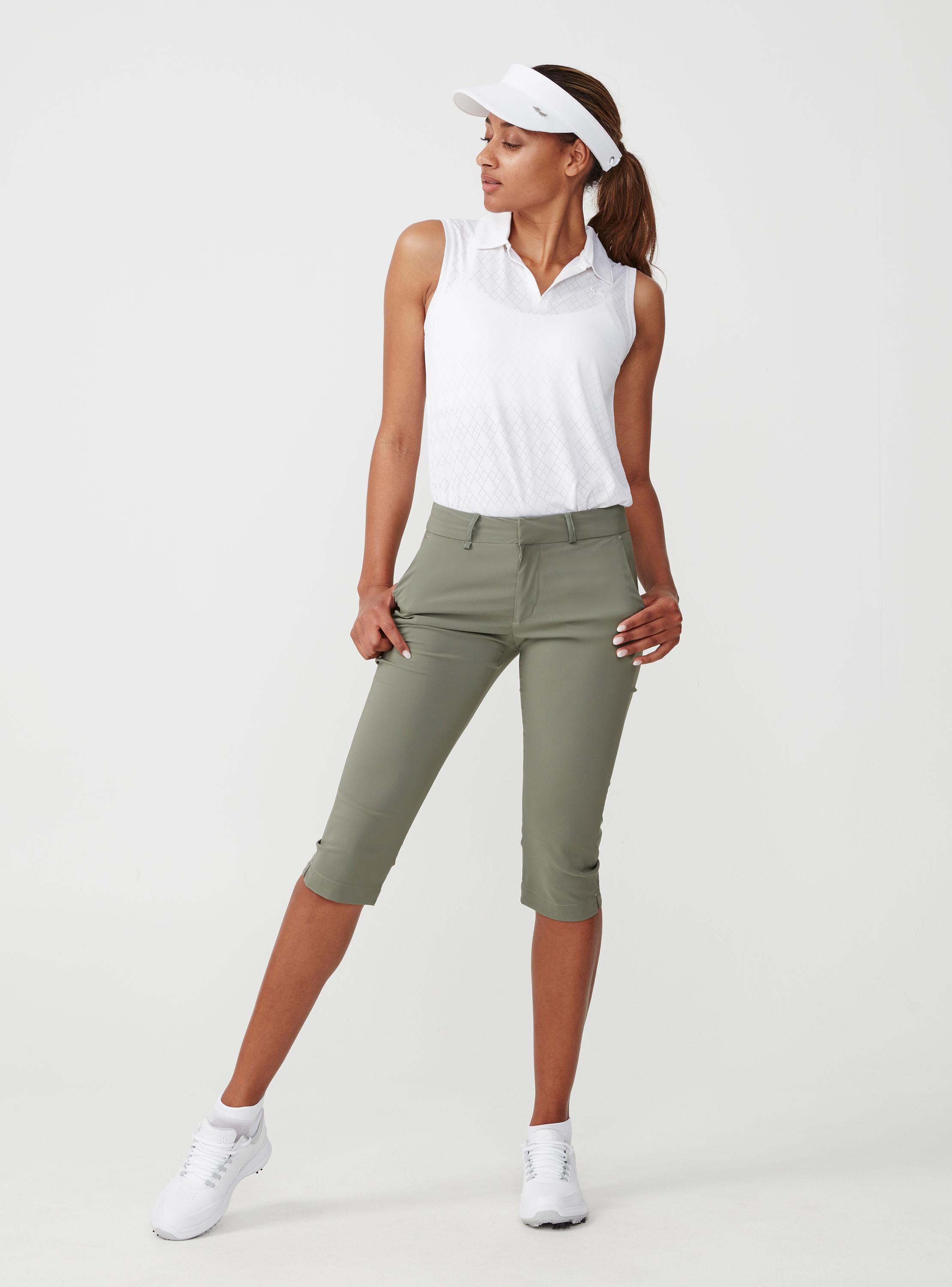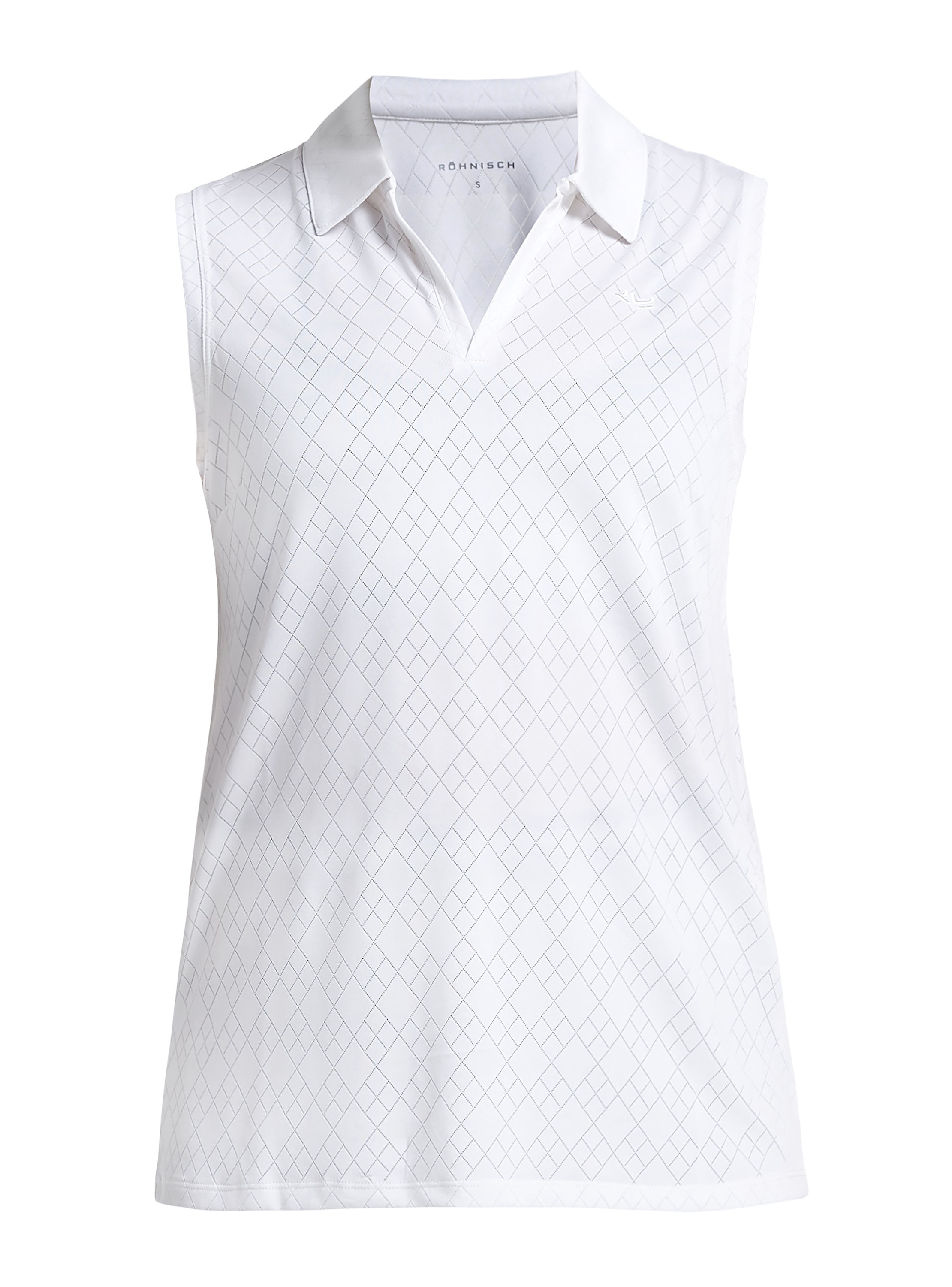 Dieses ärmellose weiße Poloshirt aus Funktionsmaterial kann sich auf dem Golfplatz genauso gut sehen lassen wie in der Stadt. Das feine Lochmuster sorgt für einen eleganten, femininen Look.